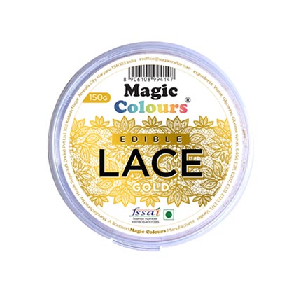Magic Colours Edible Lace is a versatile gel-like product designed for decorating cakes and creating intricate lace designs. To use, simply spread the gel onto a lace mat and allow it to set overnight, forming delicate edible lace patterns. This easy-to-use product adds an elegant and sophisticated touch to your baked creations, perfect for both professional bakers and home enthusiasts. Net Weight 150 g.
